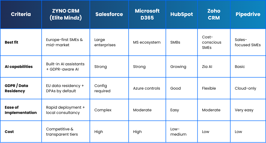 Elite Mindz ZYNO CRM brings all these solutions together—offering GDPR-ready infrastructure, seamless integrations, modular deployments, AI with human-in-the-loop guardrails, and tailored onboarding—making it the ideal CRM for European businesses in 2025.