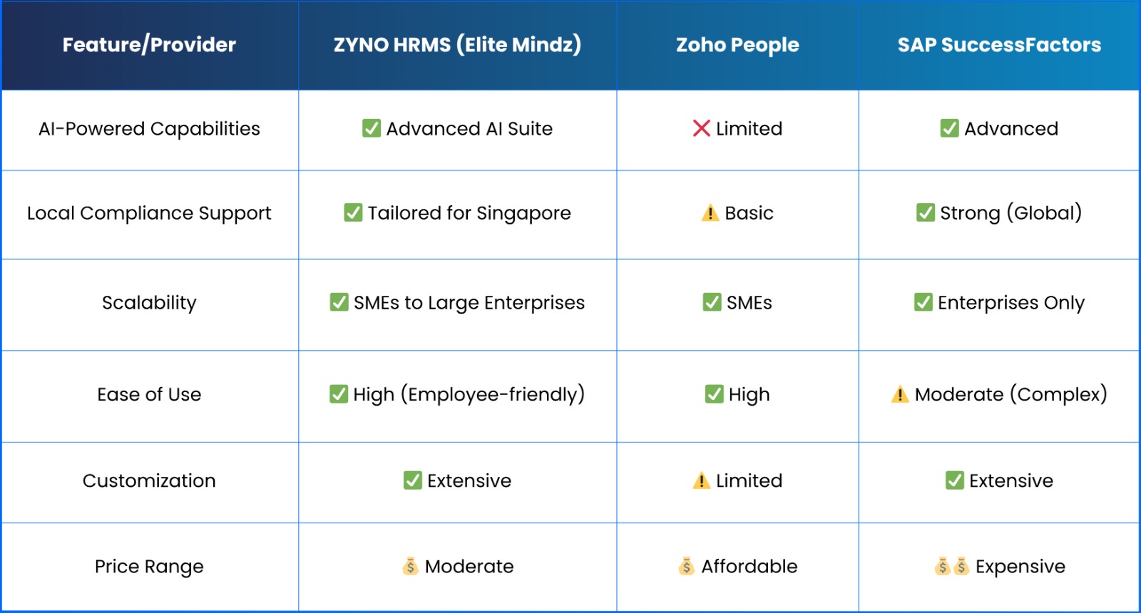 The adoption of cloud-based HRMS in Singapore is accelerating as companies move toward digital-first strategies. Businesses are seeking scalable, compliant, and AI-powered systems to stay competitive in a fast-changing market. While providers like Zoho People and SAP SuccessFactors offer valuable features, Elite Mindz’s ZYNO HRMS truly stands apart. As the world’s first AI suite of HRMS solutions, it delivers a local solution for a global cause, combining compliance, automation, and employee experience.