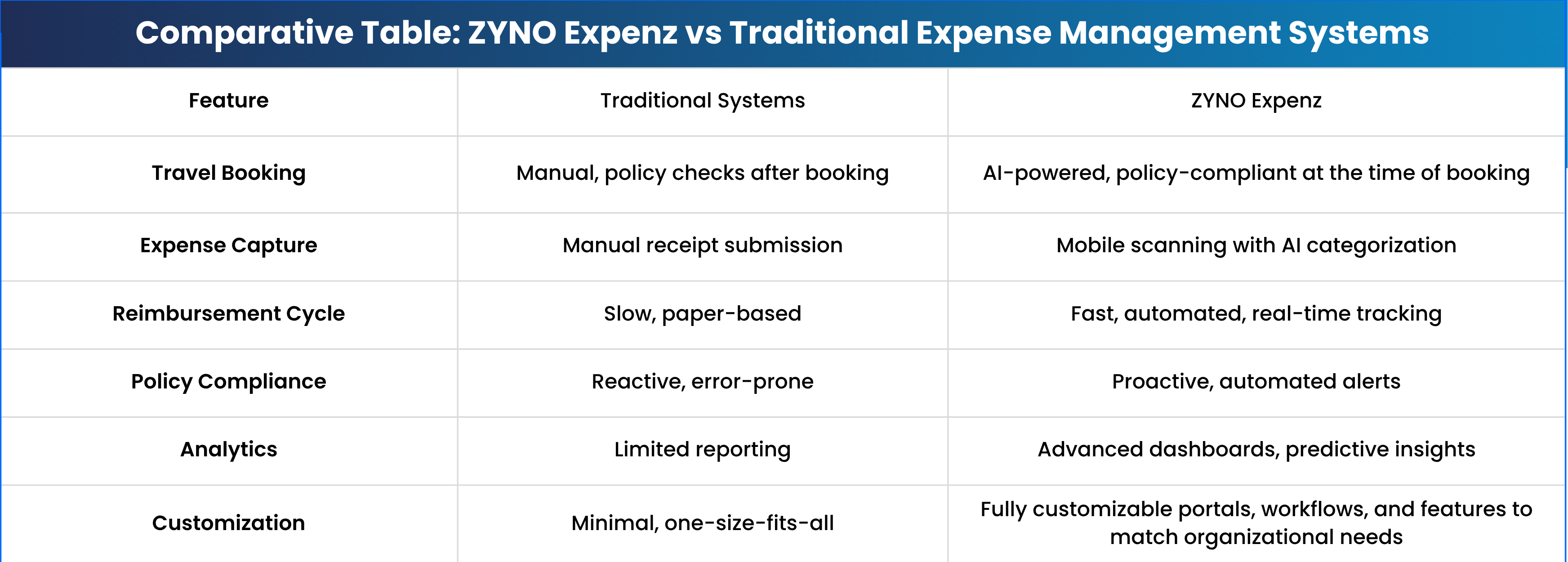 Although traditional expense management systems still rely primarily on human intervention, ZYNO Expenz utilizes AI and automation to offer a genuinely integrated travel and expense solution. Here’s a comparison:
