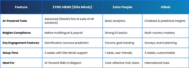 Investing in the right HR software systems in Belgium can transform how your business engages, manages, and retains talent. Elite Mindz ZYNO HRMS, part of the world’s first AI suite of HR solutions, offers a local solution for a global cause, ensuring productivity, compliance, and employee satisfaction. Alongside top providers like Zoho People and HiBob, these employee engagement software in Belgium help streamline HR, foster engagement, and drive data-backed decisions.